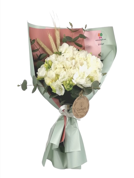 Çiçekgift Floral Designers ekibimizin özenle konseptini hazırladığı, harika kokulu beyaz frezya okaliptus ve kuru çiçeklerden bir bukettir.