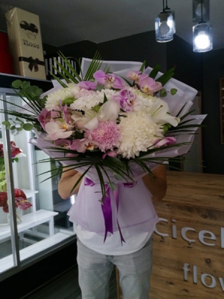 Çiçekgift Floral Designers ekibimizin özenle konseptini hazırladığı, harika bir bukettir. Pembe mor tonlarda orkide, beyaz anastasia, beyaz lilyum, fenix okaliptus ile hazırlanmış şık bir bukettir.