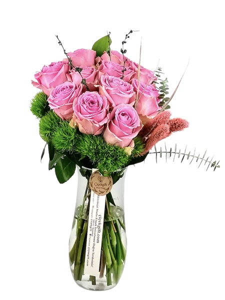 Çiçek Arajmanı, Floral Designers ekibimizin özenle konseptini hazırladığı, harika çiçeklerden bir derlemedir. İthal Pembe güllerin (10 adet),okaliptus ve kuru çiçekler ile en güzel hali. Sevdiklerinizin hayatına keyif mutluluk katabilecek harika bir hediyedir.